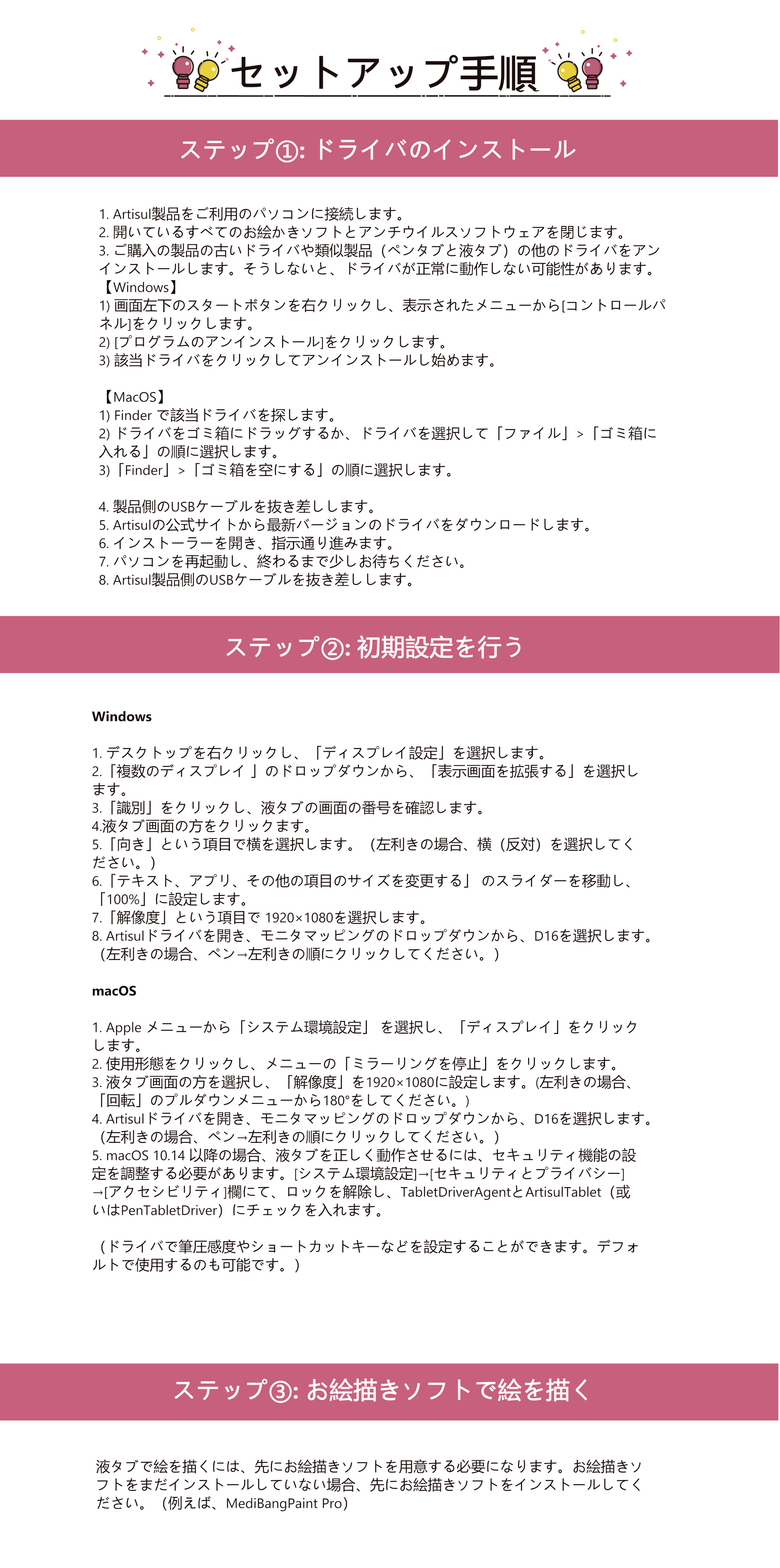 Important Note / 重要事項•Please uninstall all previously installed tablet drivers (Artisul or other brands) from the Control Panel before you install the latest Artisul driver.•お絵描き初心者、初めてArtisul製品を使う方もいらっしゃるかと思いますので、セットアップ手順とよくある質問をまとめました。少しでもお役に立てれば嬉しいです。ご不明な点などございましたら、ご遠慮なくお問い合わせください。今後ともよろしくお願いします。(連絡先:japan.cs@artisul.com サポートサイト:support-jp.artisul.com)