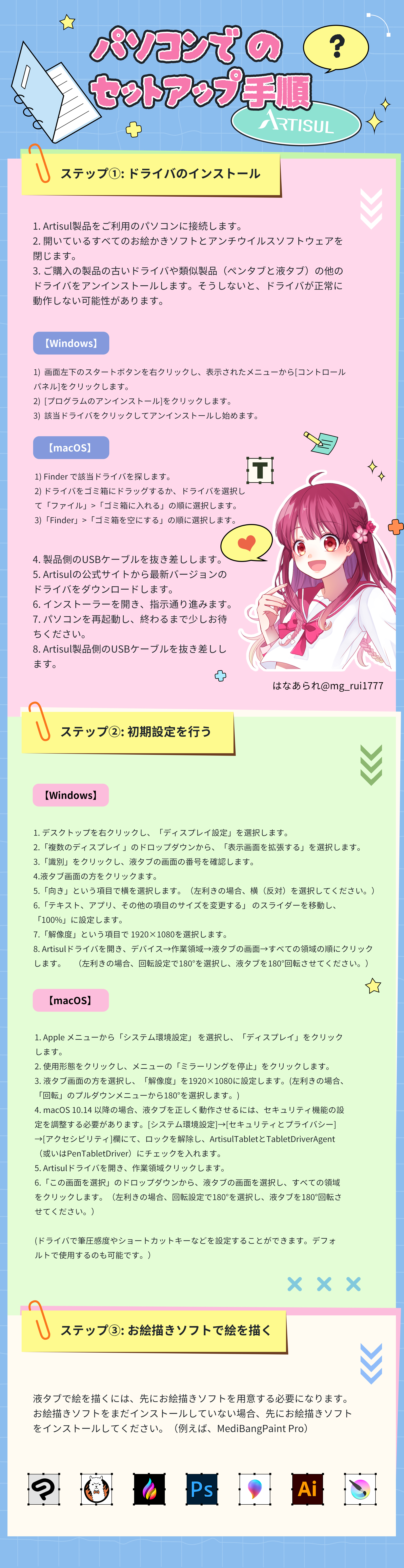 Important Note / 重要事項•Please uninstall all previously installed tablet drivers (Artisul or other brands) from the Control Panel before you install the latest Artisul driver.•お絵描き初心者、初めてArtisul製品を使う方もいらっしゃるかと思いますので、セットアップ手順とよくある質問をまとめました。少しでもお役に立てれば嬉しいです。ご不明な点などございましたら、ご遠慮なくお問い合わせください。今後ともよろしくお願いします。(連絡先:japan.cs@artisul.com サポートサイト:support-jp.artisul.com)