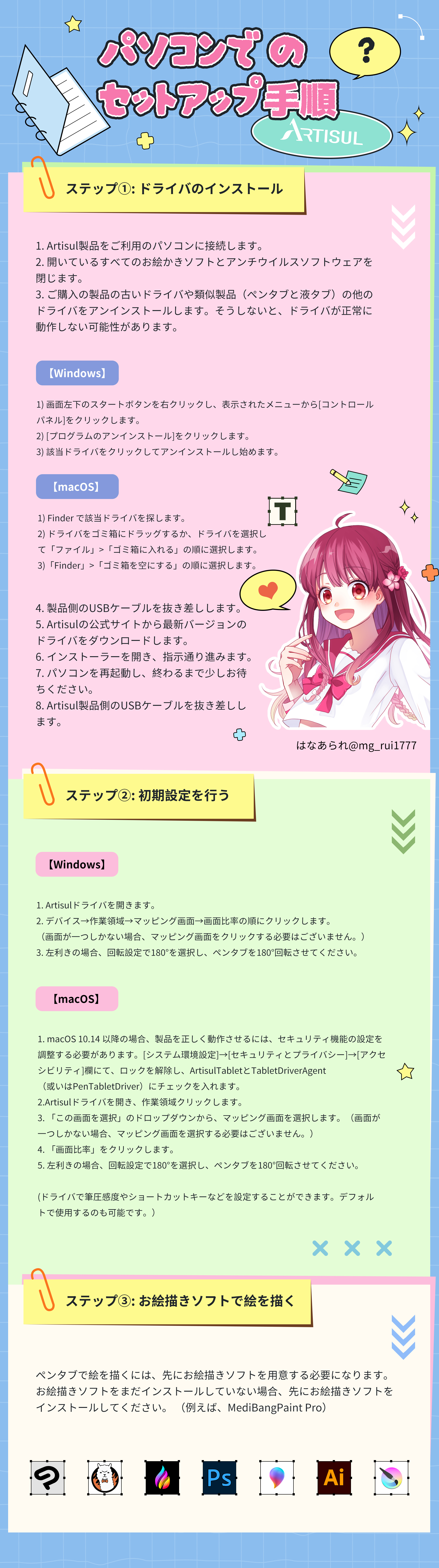 •お絵描き初心者、初めてArtisul製品を使う方もいらっしゃるかと思いますので、セットアップ手順とよくある質問をまとめました。少しでもお役に立てれば嬉しいです。ご不明な点などございましたら、ご遠慮なくお問い合わせください。今後ともよろしくお願いします。(連絡先:japan.cs@artisul.com サポートサイト:support-jp.artisul.com)